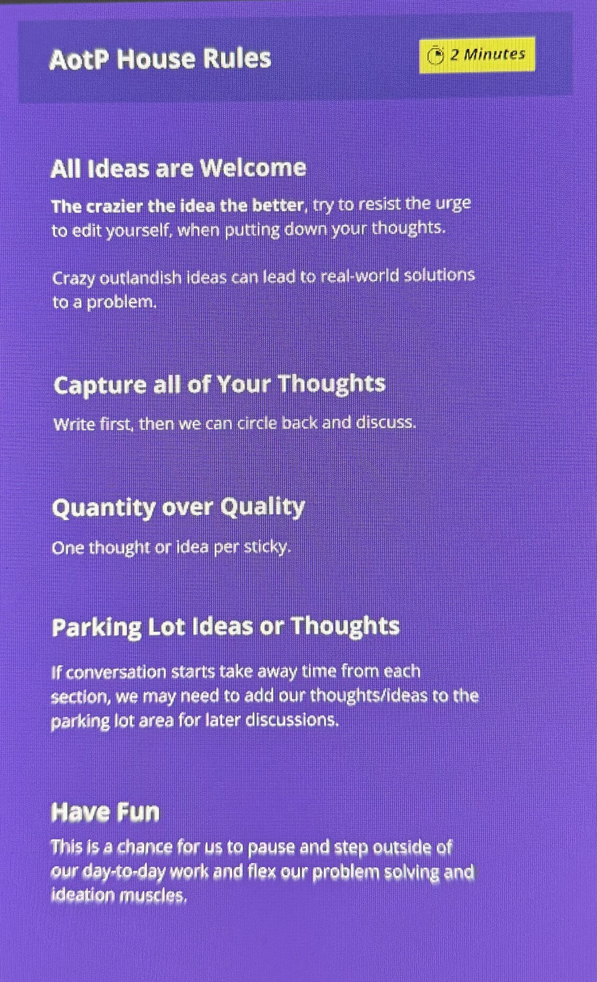 I encouraged a "yes, and" approach after the first round of focused writing. After the group discussed and voted on the top ideas, I urged participants to build on their neighbors' ideas, pushing their thoughts even further or drawing inspiration to develop completely new ideas to share with the group.